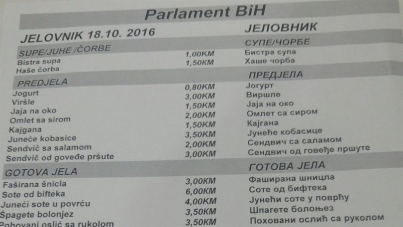 Navodno su se pojedini službenici i parlamentarci u ovoj državnoj instituciji požalili da se u restoranu gdje se hrane nema dovoljno svinjećeg mesa i specijaliteta srpske kuhinje, dok se na istom jelovniku nalazi mnoštvo jela iz bosanske i turske kuhinje. Požalili su se također da već godinama u ovom restoranu uopšte nema srpske salate.