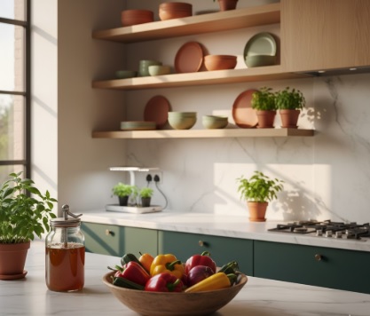 U kuhinjama dominira trend uklanjanja gornjih ormarića kako bi se stvorio otvoren i prozračan prostor, dok police krase ručno rađena keramika i svježe začinsko bilje.
