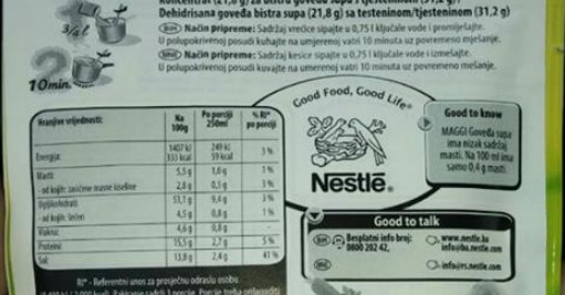 Prilikom kupovine vidio sam akciju na Maggi supama (valjda da nam prodaju što vise svojih proizvoda u toku ramazana), tako da sam odlučio da kupim tih goveđih supa. Kada sam uzeo Maggi goveđu supu primjetio sam da je na stražnoj strani nalijepljen novi sadržaj. Po izlasku iz marketa odlučio sam da odlijepim tu neljepnicu i da vidim šta piše ispod.Tada sam doživio šok, u rubrici sastojci pisalo je SVINJSKA MAST!!!!!